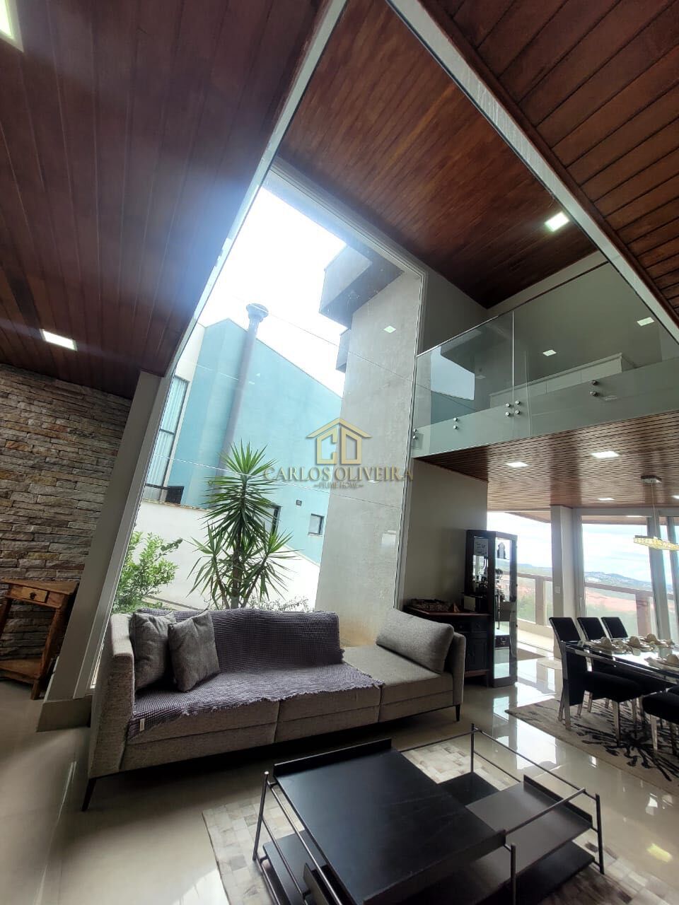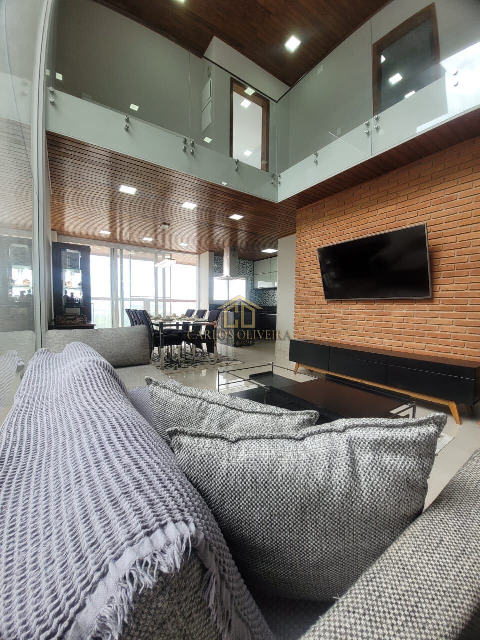 Sala de estar, jantar e cozinha integradas, com pé-direito duplo que valoriza amplitude e luminosidade.